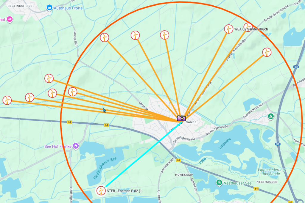 In dieser Karte haben wir die Standorte der geplanten Windgiganten eingetragen. Wenn ihr weiter rauszoomt, findet ihr zur Orientierung auch den ungefähren Bereich des von der Lippebrücke sichtbaren Windparks Buke.